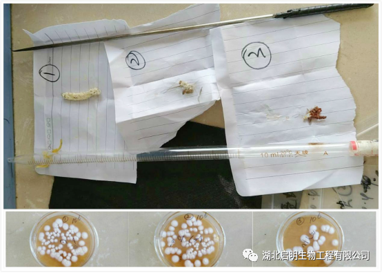 2020年4月廣西林業(yè)部門從白僵菌使用地區(qū)采集了三個(gè)典型白僵菌感染的宿主僵蟲,并寄回湖北啟明生物工程有限公司進(jìn)行孢子分離,復(fù)壯。