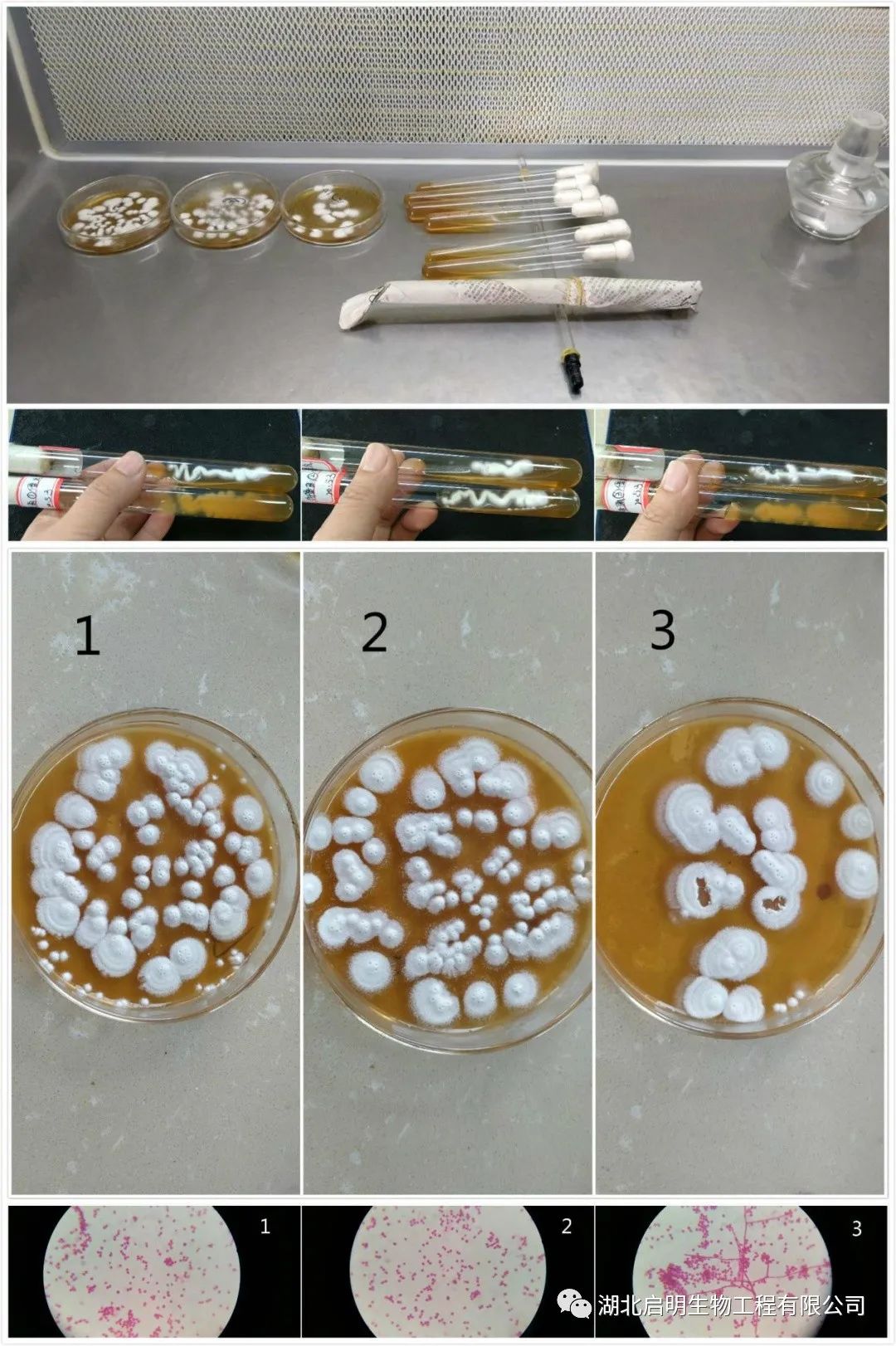 單孢分離后的白僵菌轉(zhuǎn)接試管,并在PDA培養(yǎng)基上考察生長(zhǎng)速度及產(chǎn)孢情況,其表現(xiàn)均優(yōu)于啟明公司的原始菌株。