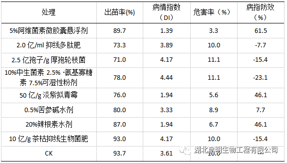 調(diào)查結(jié)果表明,各處理小區(qū)線蟲病發(fā)生整體較輕,對(duì)照區(qū)的病情指數(shù)僅為3.61,危害率為10.0%,這與2019年山藥生長(zhǎng)期間天氣嚴(yán)重干旱有關(guān)。